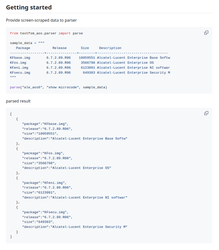 Parse semi-structured cli data to structured data ready to be ingested by your network automation pipeline. Automatically transform gathered output from screen-scraping tools like Netmiko, Scrapli and Paramiko. Receive uniform data across Alcatel-Lucent Enterprise devices running AOS 6 or AOS 8.